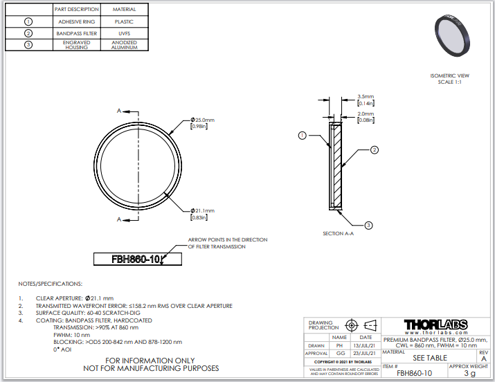 Thorlabs索雷博 FBH860-10 硬膜带通滤光片