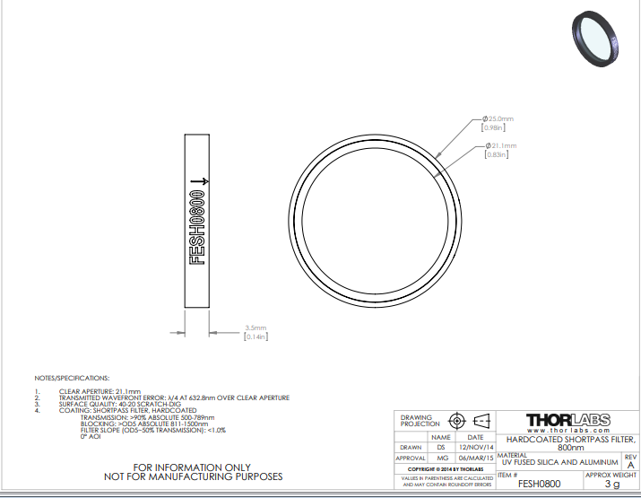 Thorlabs索雷博 FESH0800 Ø25.0 mm短波通滤光片