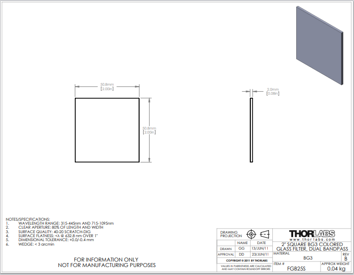 | 宽容 | +0.0/-0.4 毫米 (直径) | +0.0/-0.4 mm (方形滤光片的长度和宽度) |