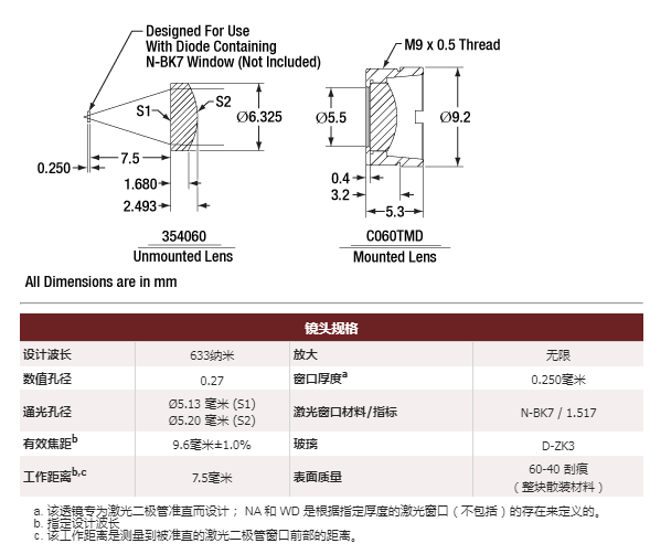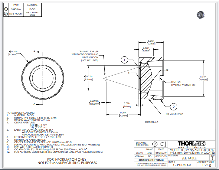 Thorlabs索雷博 C060TMD-A 非球面透镜