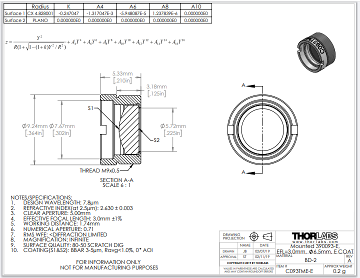 Thorlabs索雷博 C093TME-E 非球面透镜