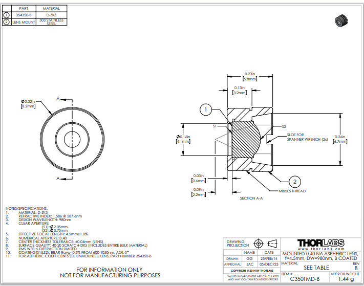 THORLABS 索雷博 C350TMD-B 非球面透镜