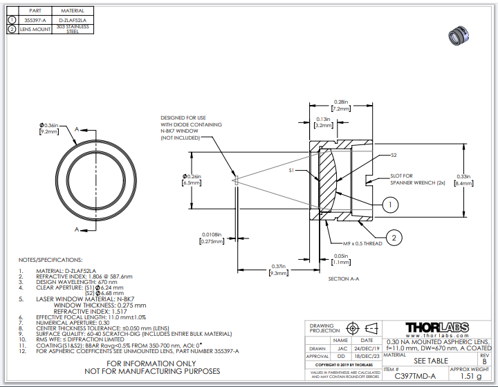 Thorlabs索雷博 C397TMD-A 非球面透镜