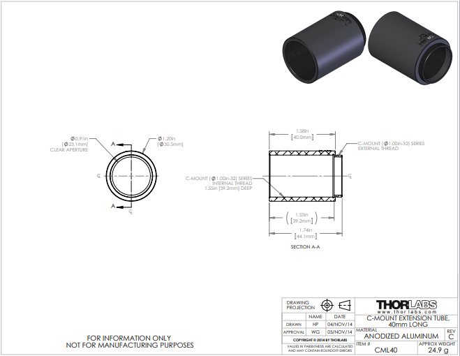 Thorlabs索雷博 CML40 - C-Mount延长管