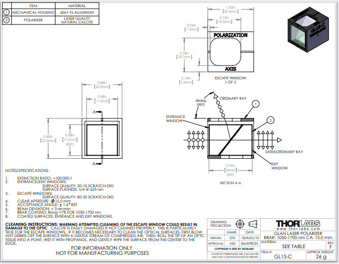 Thorlabs索雷博 GL15-C - 格兰-激光偏振器
