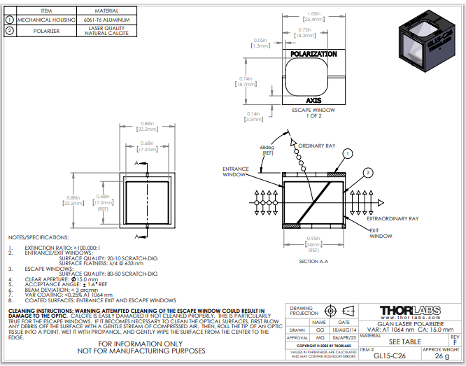 Thorlabs索雷博 GL15-C26 - 格兰-激光偏振器