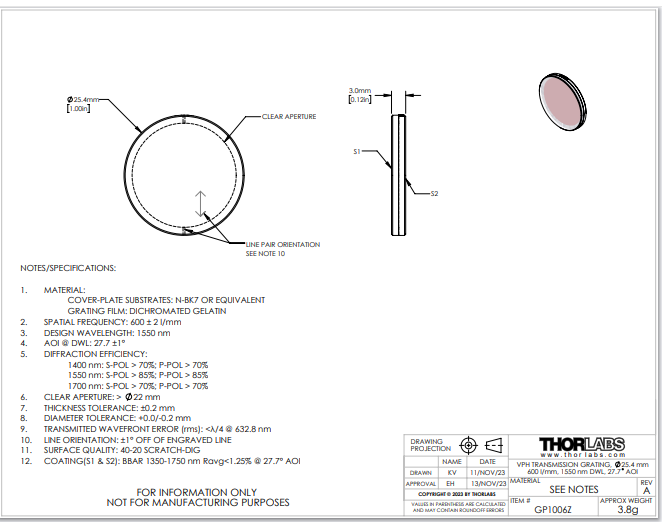 Thorlabs索雷博 GP1006Z - 体相位全息透射光栅