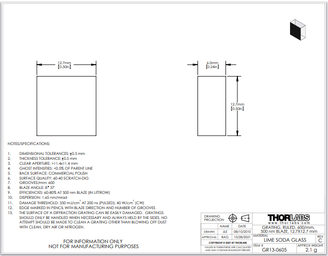 Thorlabs索雷博 GR13-0605 - 刻划衍射光栅