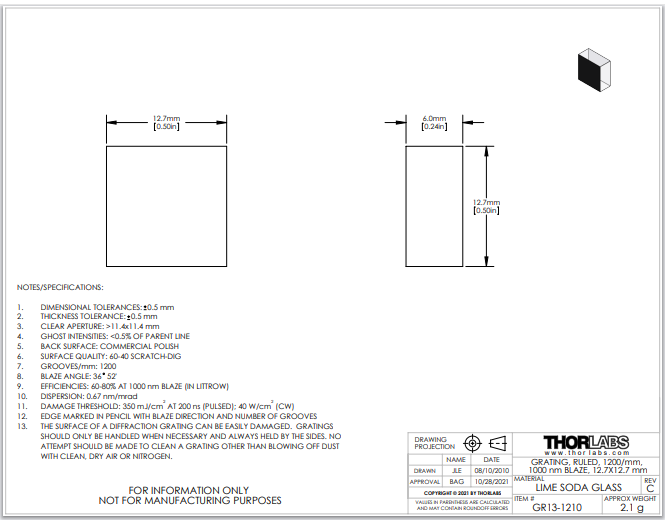 Thorlabs索雷博 GR13-1210 - 刻划衍射光栅