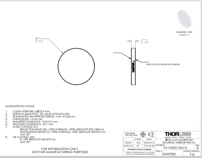 Thorlabs索雷博 DMSP900 短波通二向色镜