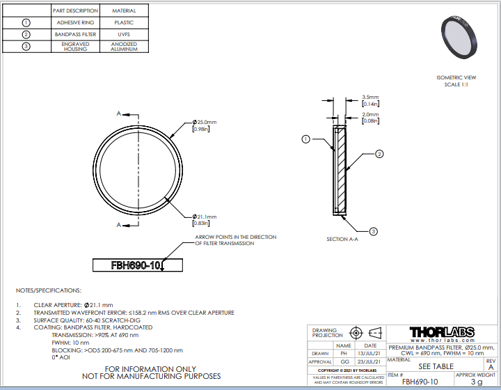 Thorlabs索雷博 FBH690-10 硬膜带通滤光片