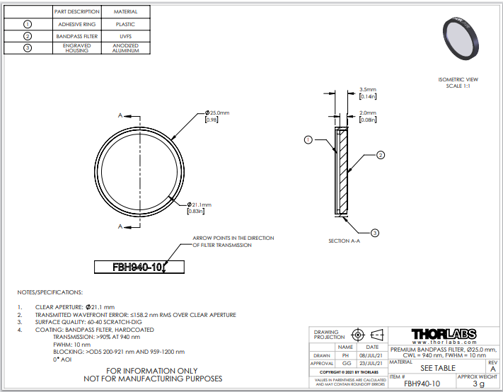 THORLABS 索雷博   FBH940-10 硬膜带通滤光片