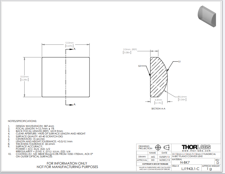 Thorlabs索雷博 LJ1942L1-C 平凸柱面透镜