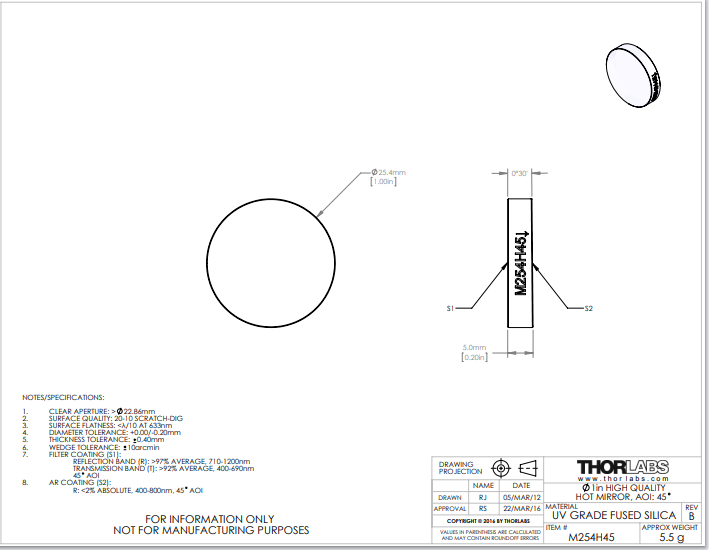 THORLABS 索雷博 M254H45 热镜
