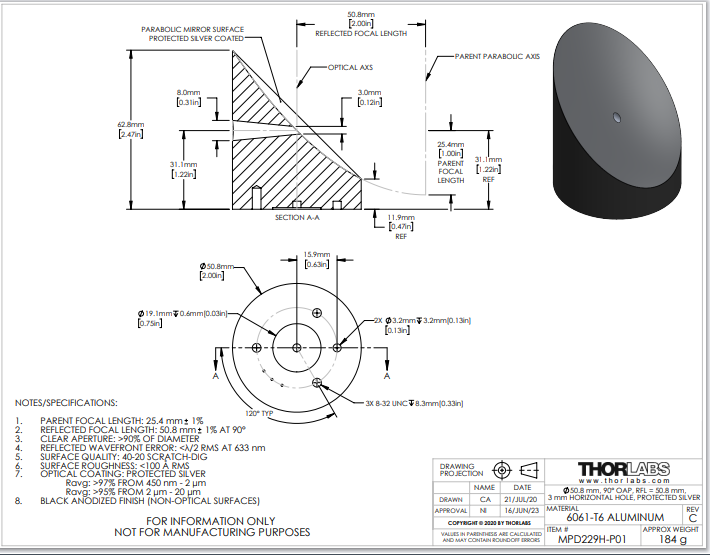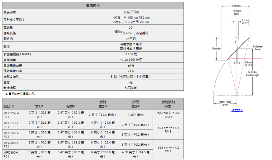 Thorlabs索雷博 MPD229H-P01 Ø2英寸90°离轴抛物面反射镜
