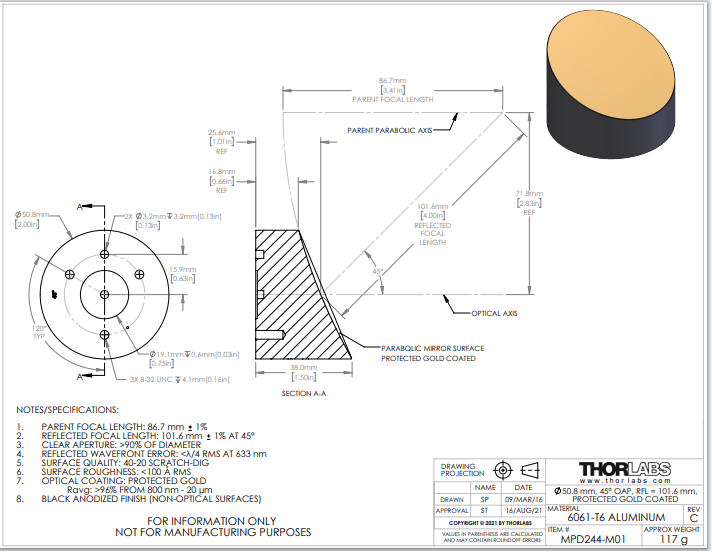 Thorlabs索雷博 MPD244-M01 45°,Ø2英寸离轴抛物面镜