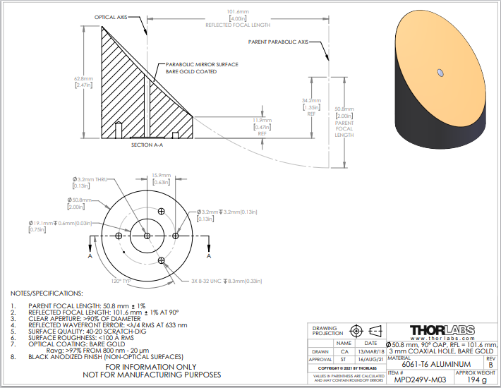 Thorlabs索雷博 MPD249V-M03 90°离轴抛物面反射镜
