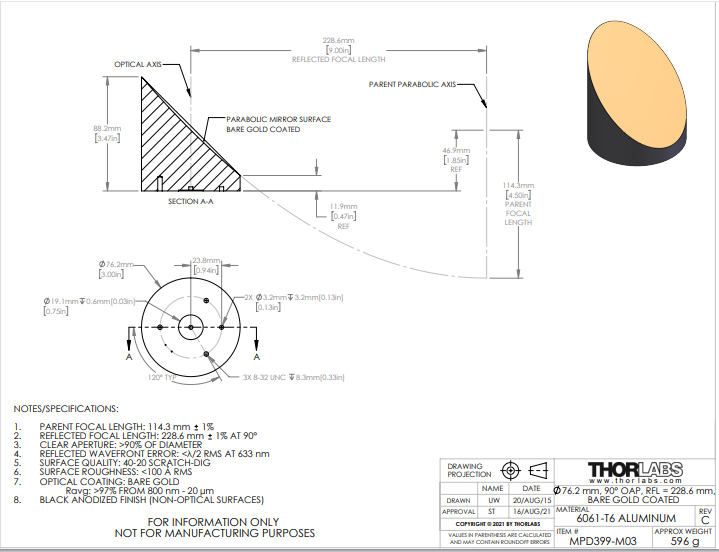 Thorlabs索雷博 MPD399-M03 90°离轴抛物面反射镜