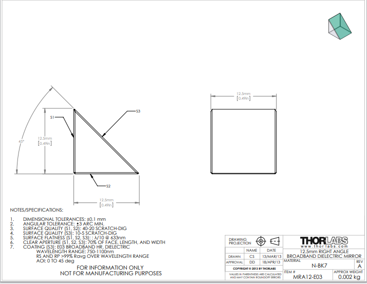 Thorlabs索雷博 MRA12-E03 直角棱镜反射镜