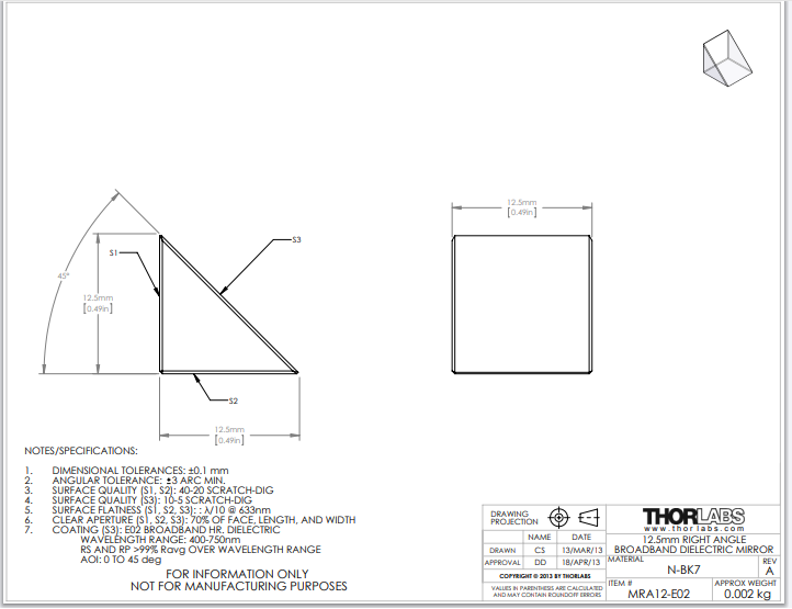THORLABS 索雷博   MRA12-E02 直角棱镜反射镜