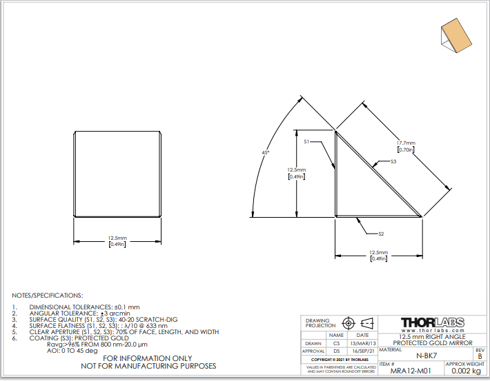 Thorlabs索雷博 MRA12-M01 直角棱镜反射镜