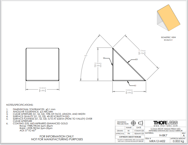Thorlabs索雷博 MRA12-M02 直角棱镜反射镜