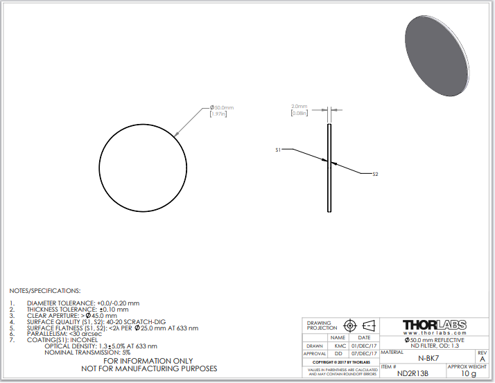 Thorlabs索雷博       ND2R13B   反射型中性密度滤光片