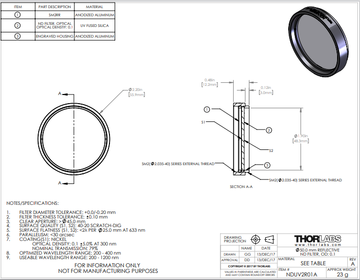 Thorlabs索雷博 NDUV2R01A 反射型中性密度滤光片