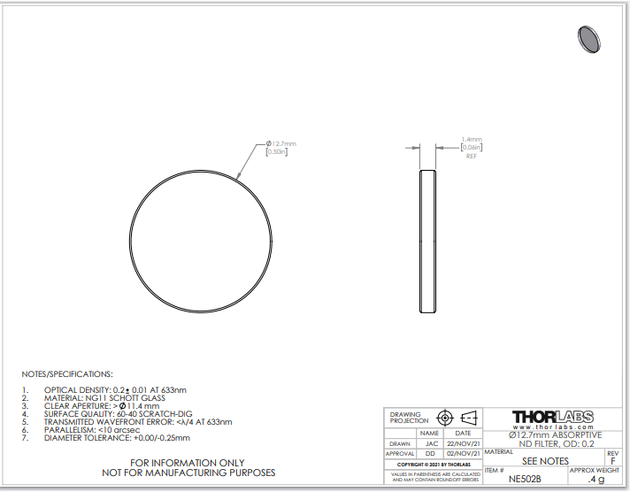 Thorlabs索雷博 NE502B 吸收型中性密度滤光片