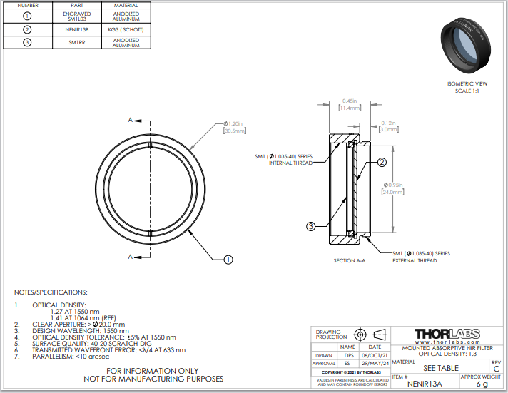 Thorlabs索雷博 NENIR13A Ø25 mm NIR吸收型中性密度滤光片