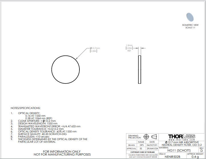 型号 NENIR502B NIR中性密度滤光片 品牌 THORLABS 索雷博