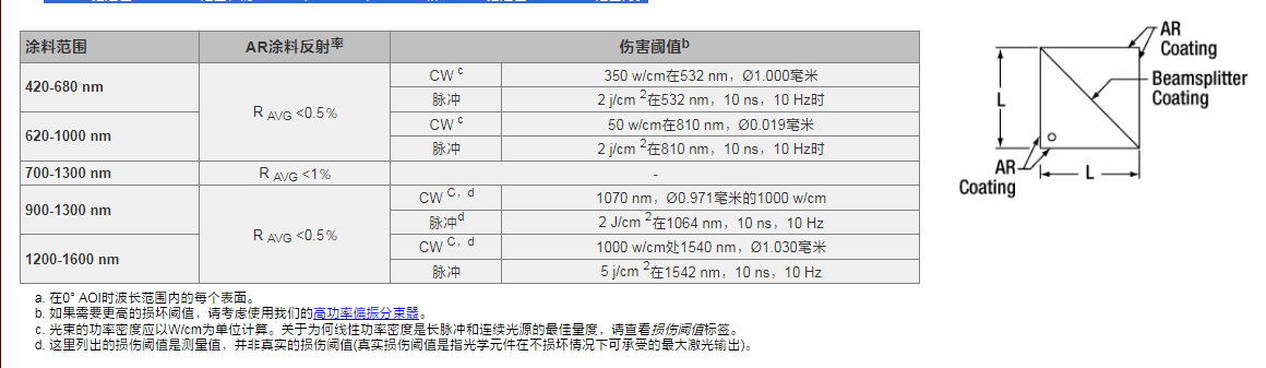 | Beamsplitter立方体尺寸 | 5毫米立方体 | 10毫米立方体 | 1/2“(12.7毫米)立方体 | 20毫米立方体 | 1“(25.4毫米)立方体 | 2“(50.8毫米)立方体 |