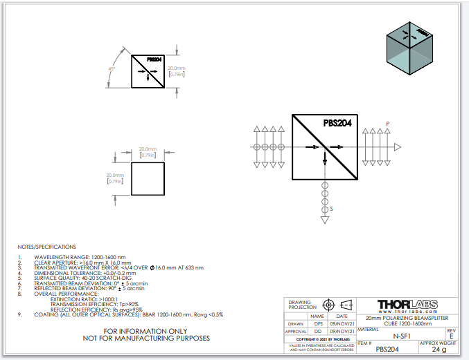 Thorlabs索雷博 PBS204 - 20 mm偏振分束立方体