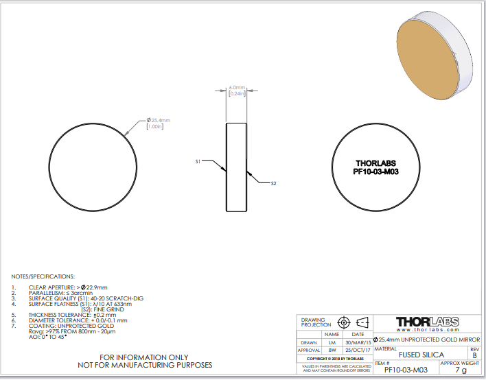 Thorlabs索雷博 PF10-03-M03 圆形平面反射镜