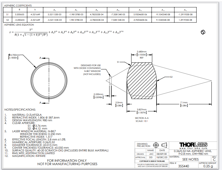 THORLABS 索雷博 355440 非球面透镜