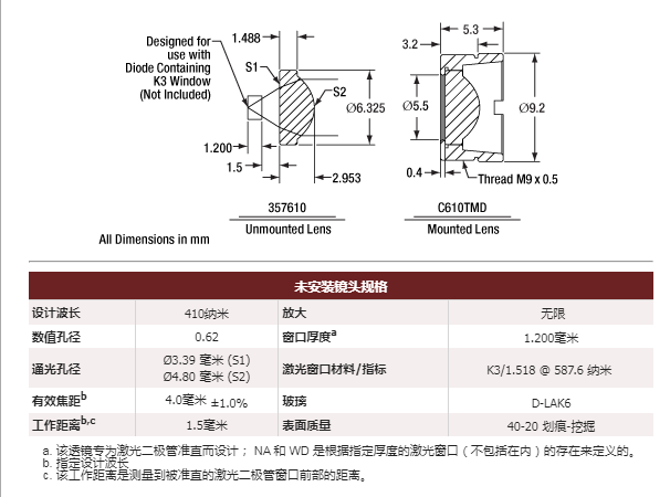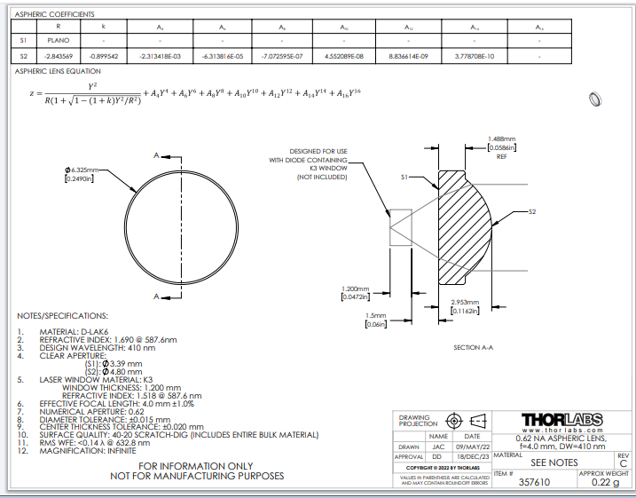 型号 357610 非球面透镜 品牌 THORLABS 索雷博