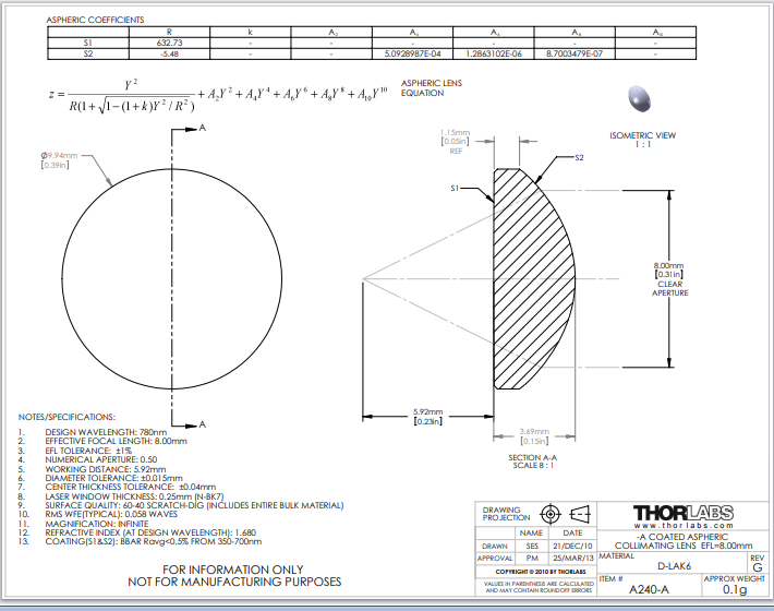 THORLABS 索雷博     A240-A 非球面透镜