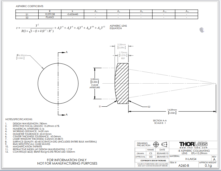 Thorlabs索雷博 A260-B 非球面透镜