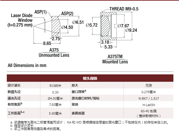Thorlabs索雷博 A375TM-C 非球面透镜
