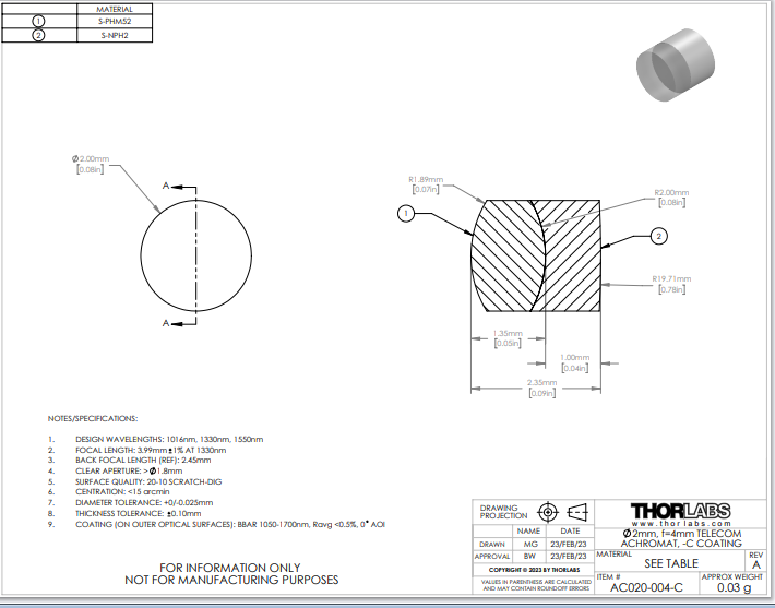 Thorlabs索雷博 AC020-004-C 消色差双胶合透镜
