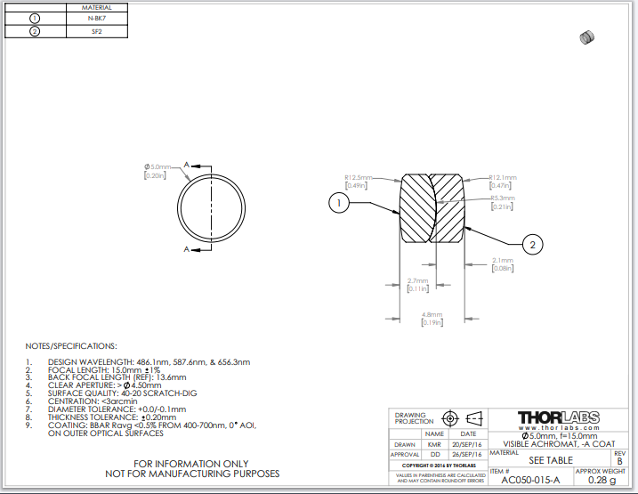 Thorlabs索雷博 AC050-015-A 消色差双胶合透镜