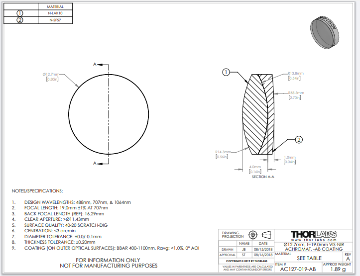 THORLABS 索雷博    AC127-019-AB 消色差双胶合透镜