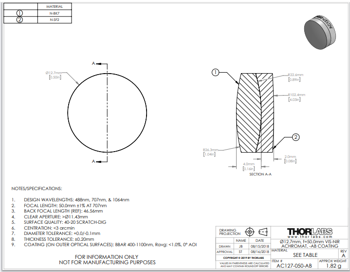 THORLABS 索雷博     AC127-050-AB 消色差双胶合透镜