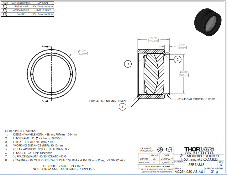 Thorlabs索雷博 AC254-050-AB-ML 消色差双胶合透镜