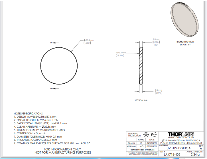 Thorlabs索雷博     LA4716-405   平凸透镜