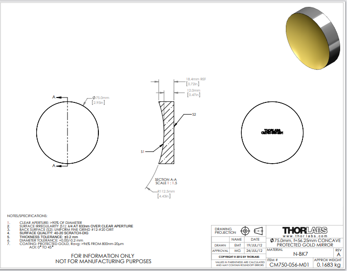 Thorlabs索雷博 CM750-056-M01 镀金凹面镜