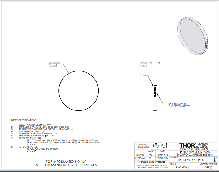 Thorlabs索雷博 DMSP605L 短波通二向色镜