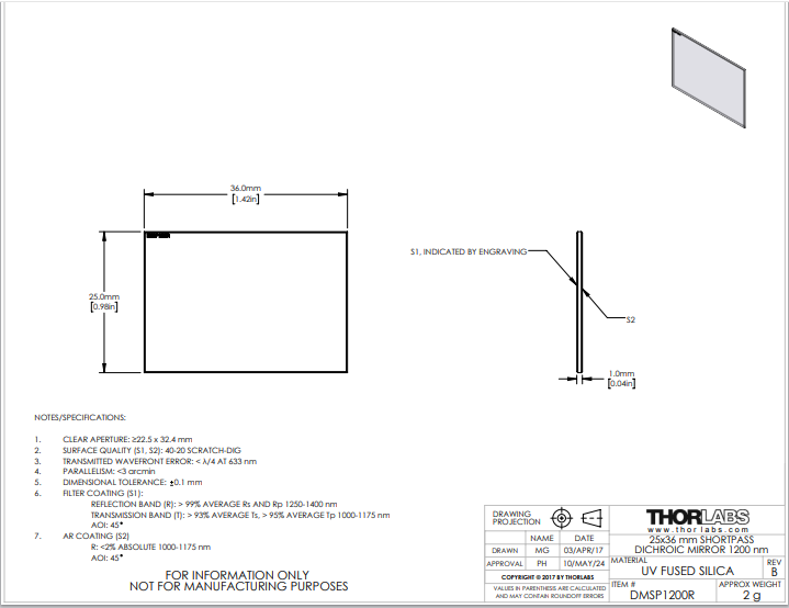 Thorlabs索雷博 DMSP1200R 短波通二向色镜