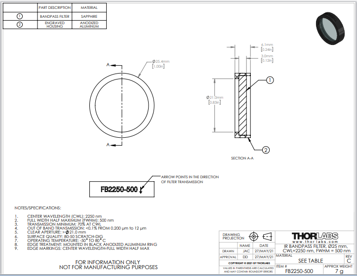 Thorlabs索雷博 FB2250-500 Ø1英寸红外带通滤光片