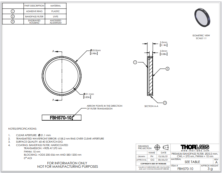 Thorlabs索雷博 FBH570-10 硬膜带通滤光片
